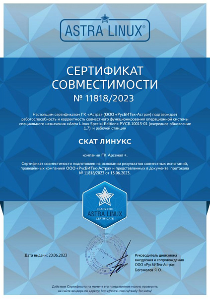 Компьютеры СКАТ, производимые нашей компанией, а именно новая модель - рабочая станция «СКАТ ЛИНУКС» сертифицирована ООО «РусБИТех-Астра» на совместимость с ОС Astra Linux Special Edition.