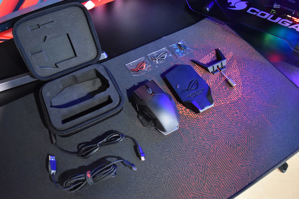 Поставляется ASUS ROG Spatha в большой стильной коробке кубической формы с присущим фирменным оформлением серии ROG. Внутри упаковки находится сама мышь, инструкция пользователя и буклет с приветствием и обращением к геймеру на манер продукции Razer. Самое же интересное, а именно специальный чехол для переноски грызуна находится на дне коробки. Внутри этого черного кейса с нанесенным на него фирменным лого Republic of Gamers, пользователь найдет: