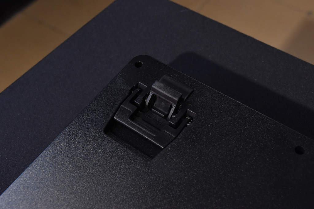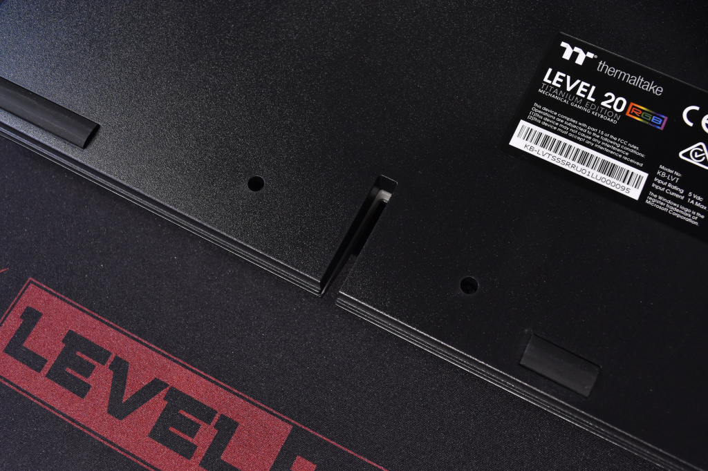 Из нестандартного можно отметить, разве что непривычно большое расстояние между двумя блоками клавиатуры. Здесь, внизу расположился небольшой вырез, который нужен для прокладки кабеля наушников или гарнитуры под основанием клавиатуры. А второй элемент – световая RGB-полоса. Оба элемента отлично вписываются и дополняют дизайн и внешний вид Thermaltake Level 20 RGB. На основании клавиатуры находится небольшая этикетка с базовой информацией по устройству и её серийным номером. Разумеется, игровой девайс оснащен прорезиненными ножками, чтобы клавиатура «не ездила» по столу. Всего таких ножек пять, четыре из которых находятся по углам, а одна снизу по центру. Благодаря им, TT Level 20 RGB очень прочно держится на столе и никуда не съедет даже, если очень захотеть. Этому также способствует достаточно большой вес устройства.