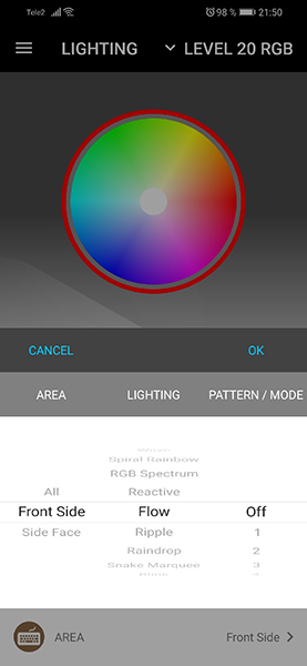 TT iTake Engine, к сожалению, не русифицирован, но это ни сколько не мешает пользоваться программой – софт весьма удобный, понятный и приятный в использовании. С ним разберется даже ребенок. Помимо программного обеспечения на ПК, есть приложения для мобильных устройств, и наконец, Thermaltake сделала версию для Android, поэтому в отличие от X1 RGB, мы смогли его протестировать. Мобильная версия называется аналогично десктопной, и предлагает геймеру даже больший функционал. К примеру, здесь игрок может также управлять подсветкой, и профилями, а также создавать макросы, но помимо этого, есть функция виртуальной клавиатуры, виртуального контроллера (это когда смартфон выполняет функцию джойстика в игре, запущенной на ПК) и голосового управления всеми настройками Level 20 RGB.