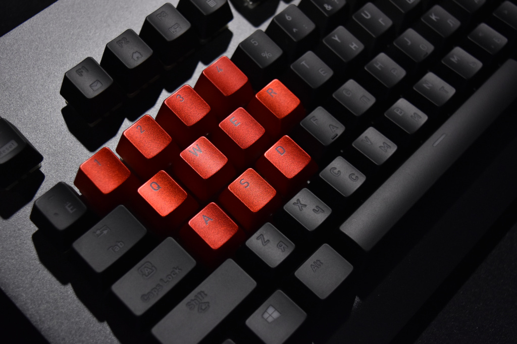 Количество одновременных нажатий – без ограничений, но этим сейчас мало кого удивишь, также, как и тем, что клавиши клавиатуры имеют ресурс в 50 миллионов нажатий. Этого должно хватить на всю жизнь, ну или пока клавиатура не сломается (в чем мы очень сомневаемся). Отдельно стоит рассказать про комплект сменных кейкапов, поставляемых в комплекте с клавиатурой. Всего их 11, и они нужны, чтобы заменить самые часто нажимаемые клавиши по мнению Thermaltake, а именно цифры 1-4, клавиши WASD, а также Q, E и R. Колпачки выполнены из аналогичного основным клавишам АБС-пластика, но красного цвета и с более гладкой поверхностью.
