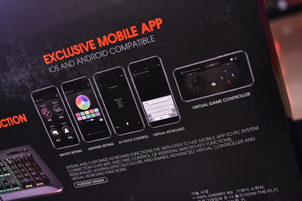 Как и предшественница, новая клавиатура упакована в стандартную картонную коробку, на передней части которой изображена клавиатура крупным планом, а на задней части производитель перечислил основные преимущества модели. Здесь, в частности, отмечены переключатели Cherry MX, RGB-подсветка, возможность записи макросов, USB-порт и аудиоразъем, мобильное приложение, а также синхронизация подсветки с устройствами Thermaltake и Razer (об этом чуть позже).