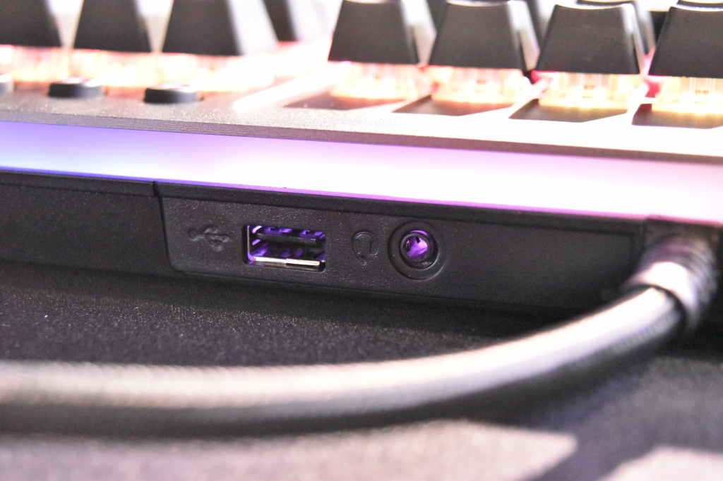 Большое дополнение к RGB-пиршеству – светодиодная полоса, расположившаяся между блоком с символьными клавишами и блоком с курсорными клавишами, о которой мы уже упоминали, но самое главное в TT Level 20 RGB – это прозрачная широкая световая панель по всему периметру корпуса клавиатуры. Благодаря ей RGB-подсветка выглядит шикарно. Других, более корректных и цензурных слов для описания подсветки в данной клавиатуре навряд ли можно подобрать. Разумеется, световая панель синхронизируется с общей подсветкой клавитуры, но благодаря фирменному софту, её свечение можно настроить отдельно.