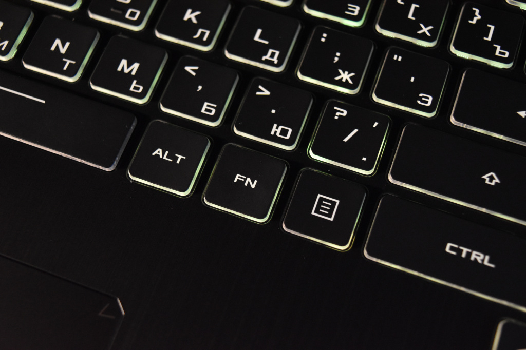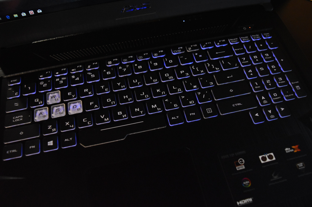 Среди устройств ввода лэптопа есть стандартный тачпад с имитацией нажатий на кнопки, а также мембранная клавиатура с трехуровневой RGB-подсветкой под стать всем трендовым игровым клавиатурам современности. Встроенная в данную модель ноутбука клавиатура имеет ход 1.8 мм, а клавиши WASD отличаются по материалу кейкапов от остальных. По всей видимости, ASUS TUF FX705GM-EW228T ориентирован для поклонников шутеров. Ресурс нажатий клавиш составляет 20 миллионов, ну а RGB-подсветка настраивается с помощью фирменного софта TUF Aura Core.