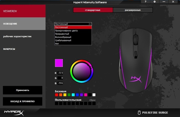 Что касается программного обеспечения, то Pulsefire Surge – это первая мышь в линейке, которая получила поддержку фирменного софта HyperX под названием «NGenuity Software». Программа интуитивно понятная и предоставляет геймеру полный комплект инструментов для персонализации настроек и параметров мышки. Помимо привычной настройки чувствительности от 100 до 16 000 dpi с шагом в 50 dpi, а также настройки профилей, записи макросов и переназначения клавиш, NGenuity Software преподносит некоторые сюрпризы. Например, при персонализации RGB-подсветки можно полностью настроить цвет, яркость и эффект свечения каждого из 32 светодиодов. Такого мы еще не видели ни в одной мышке.