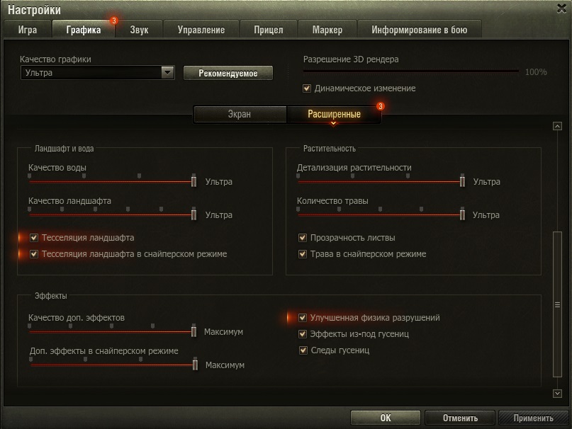 «Тесселяция ландшафта» и «тесселяция ландшафа в снайперском режиме» - относительно новые графические параметры, которые прибыли в глобальном обновлении 1.0 в 2018 году. Они отвечают за динамическую прорисовку качества ландшафта в режиме реального времени в обычном режиме и в снайперском режиме во время прицеливания. На производительность World of Tanks влияют не сильно, но на относительно слабых компьютерах, рекомендуем их отключить.